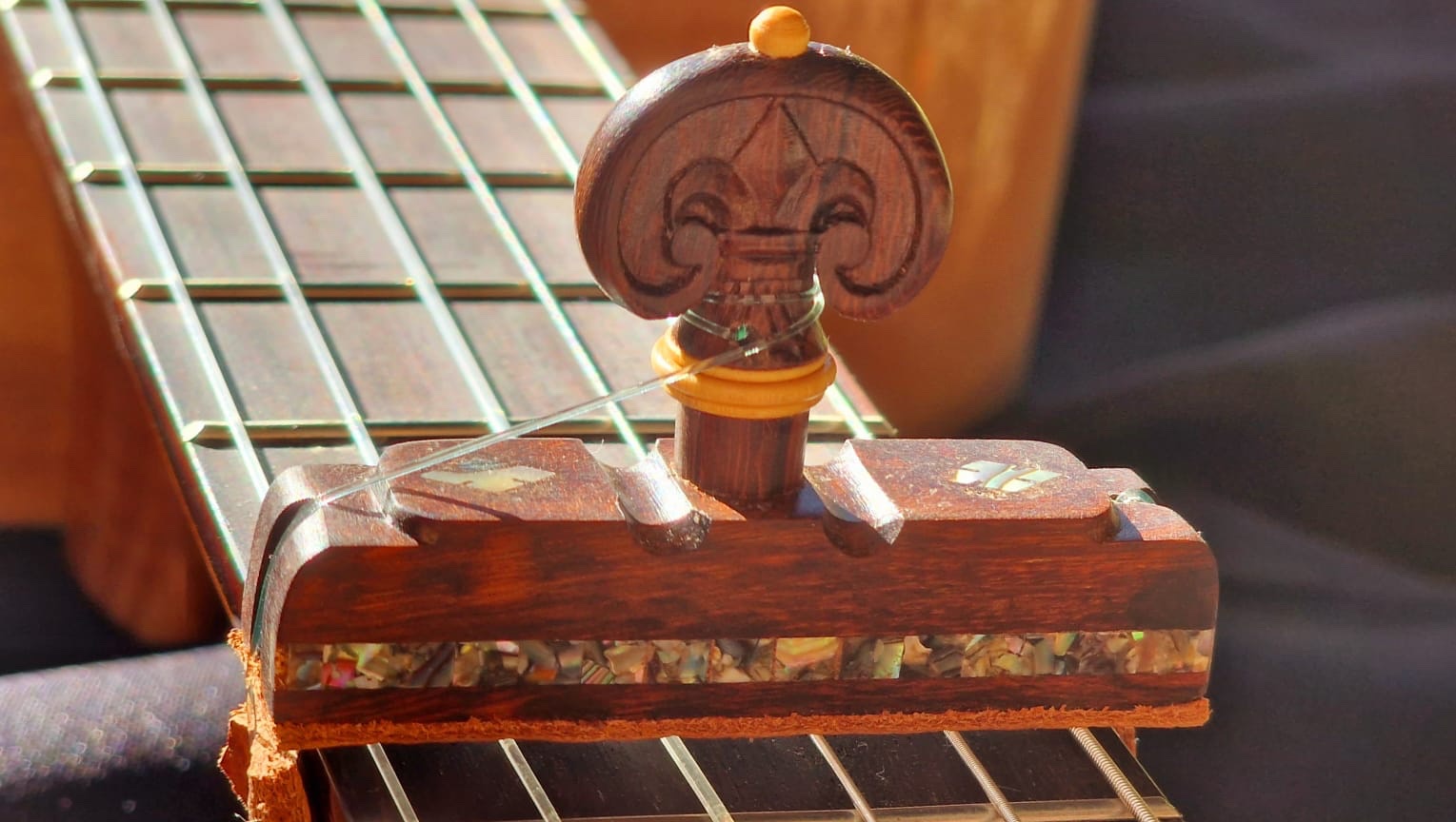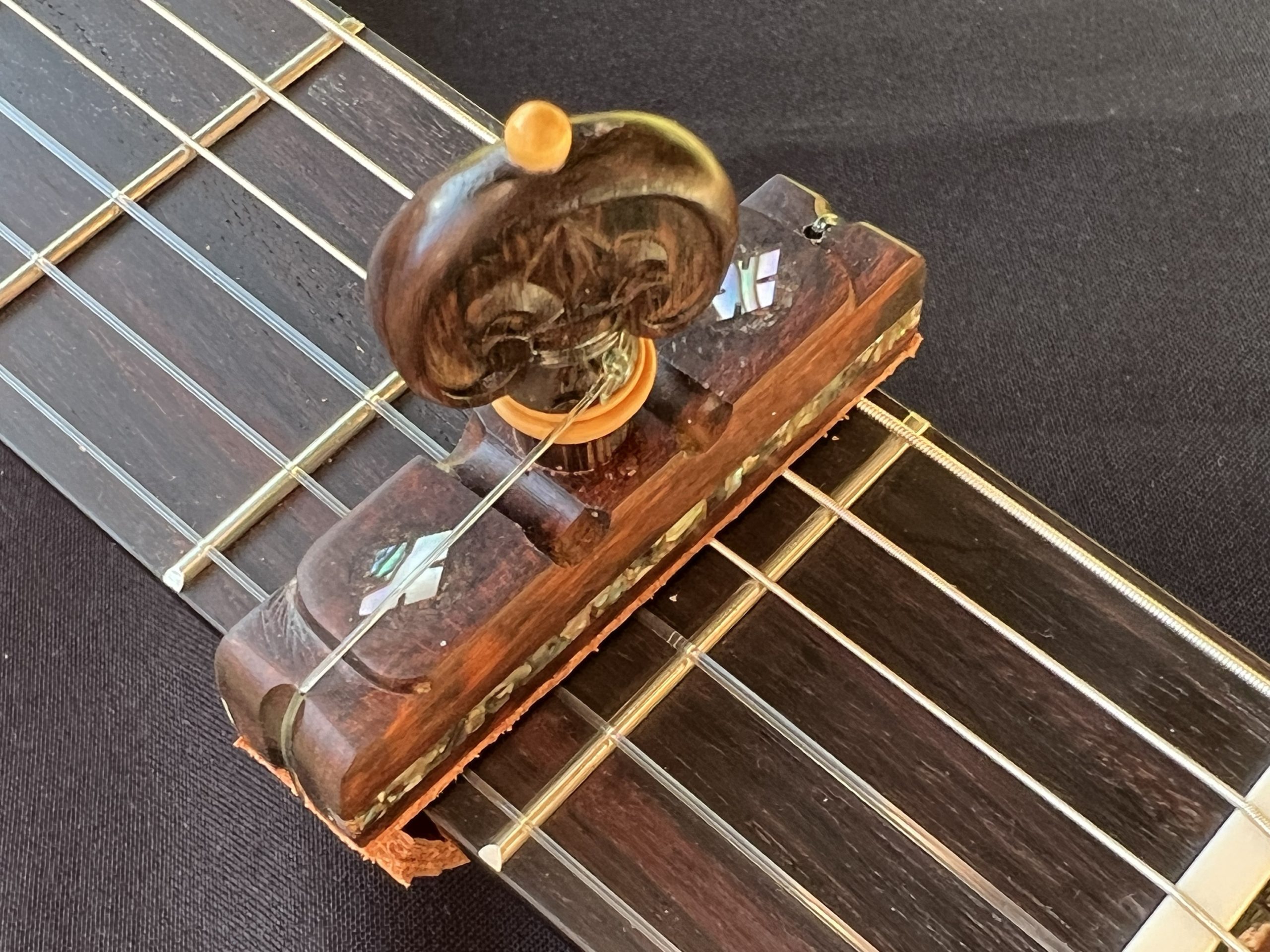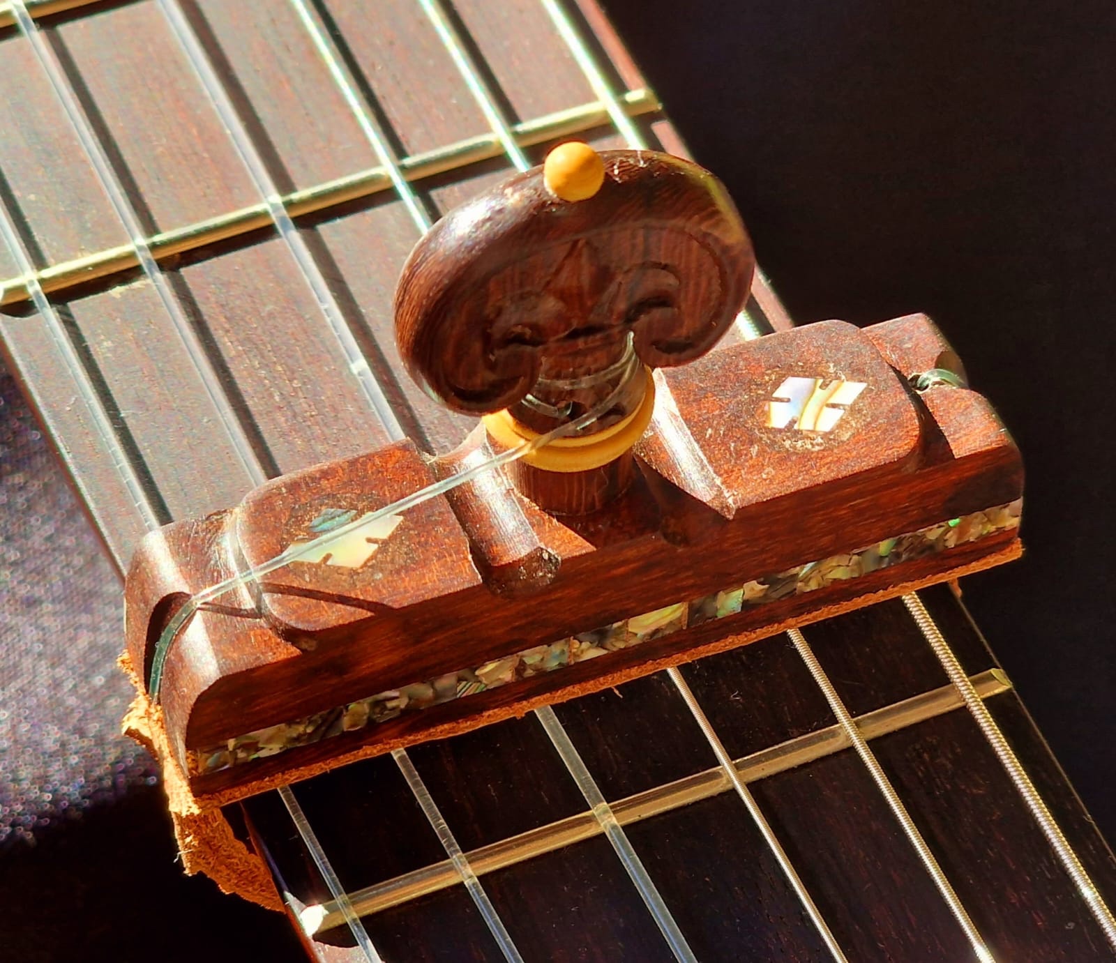 Cejilla flamenca artesana de Palo de Serpiente y Madre Perla de gran calidad y precisión.