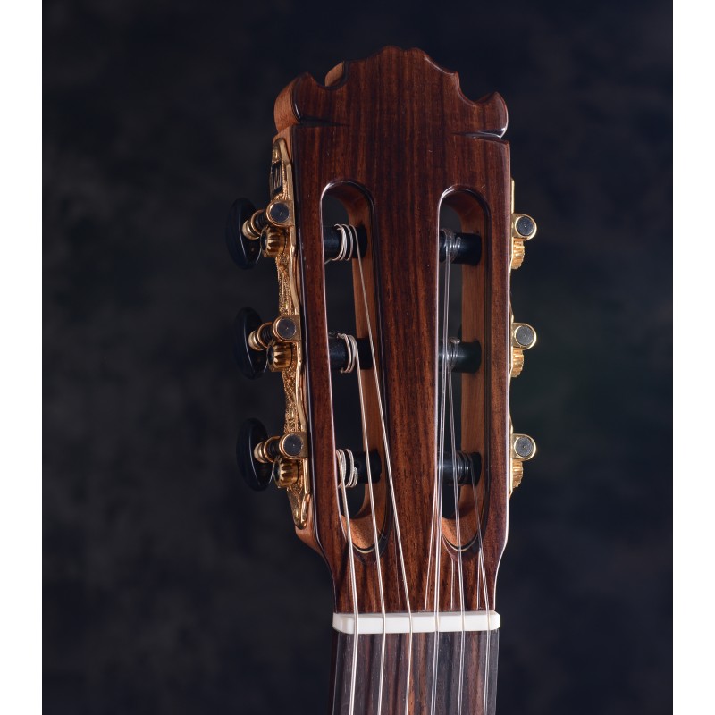 El fondo y sus aros están construidos en madera de palosanto también seleccionado, un palosanto precioso y una boca muy bonita haciéndola tener una presencia seria y formidable.