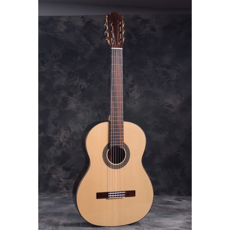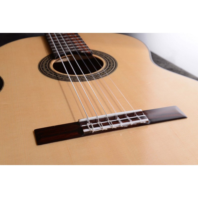 Mástil de caoba característico de Martínez, tapa maciza en madera de pino abeto seleccionada, un varetaje interior de la marca haciendo proyectar un sonido contundente y potente.