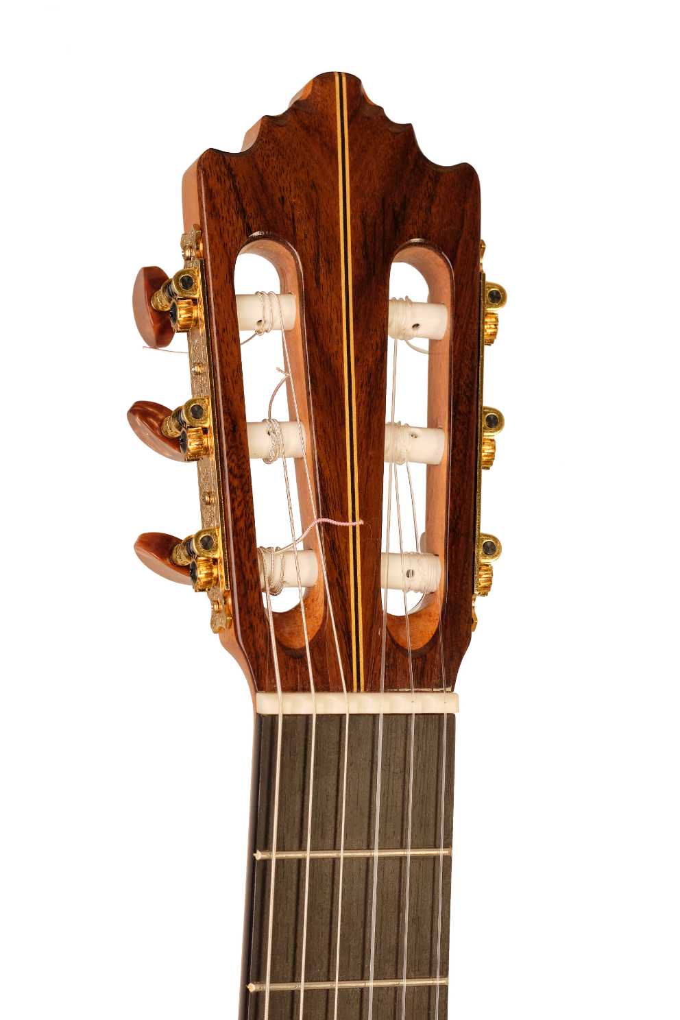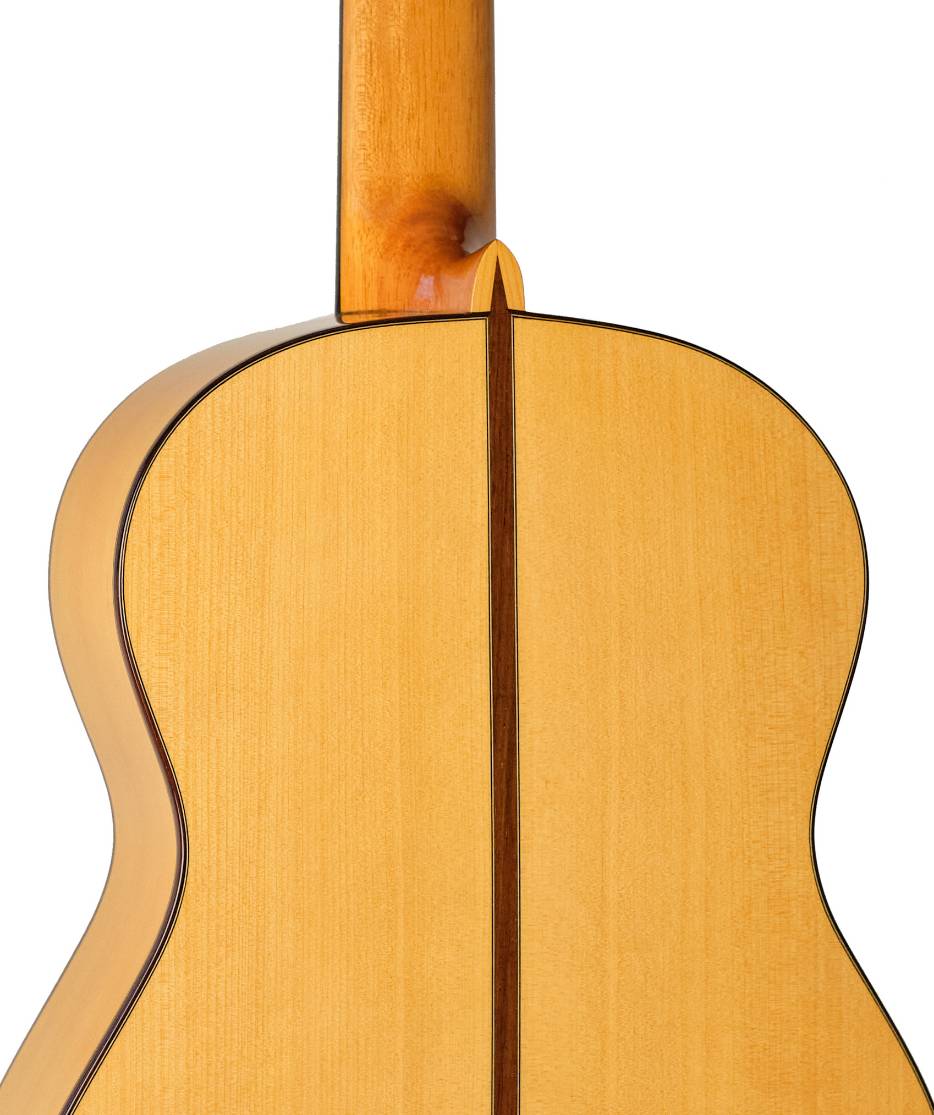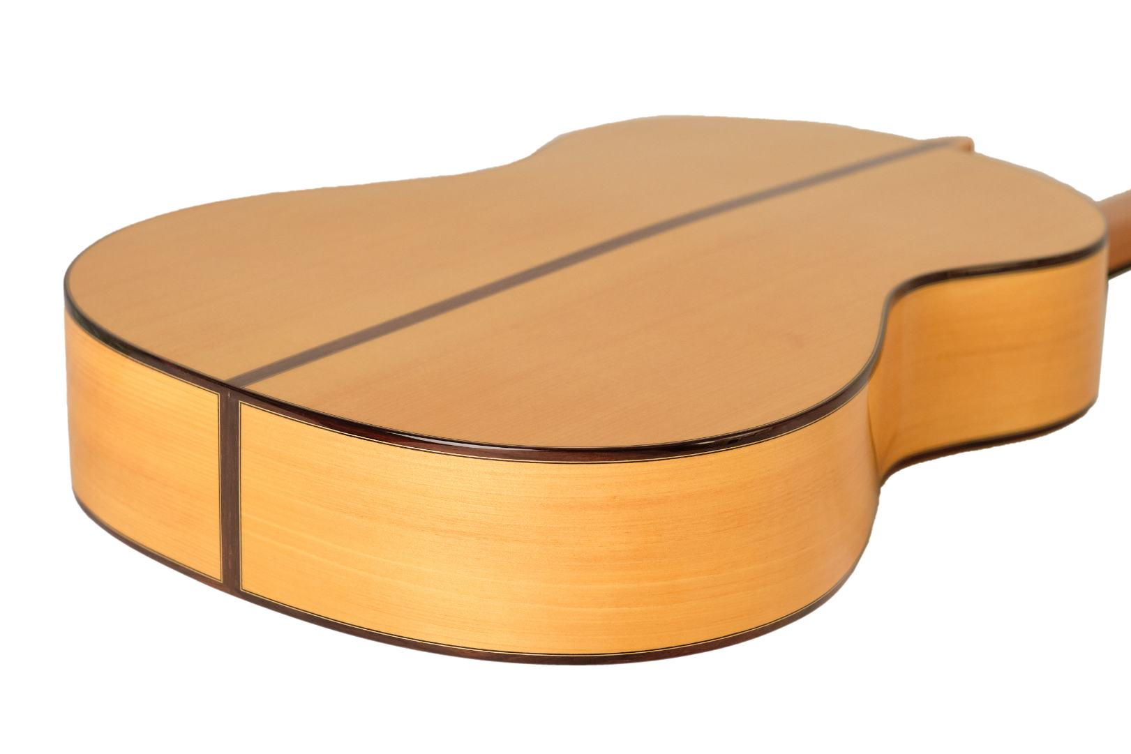 Esta guitarra flamenca de Ciprés español tiene una tapa de Pino-Abeto alemán, aros y fondo de Ciprés español con más de 40 años de curación y mango de Cedro de Honduras. Diapasón y puente de Palo Santo de la India.