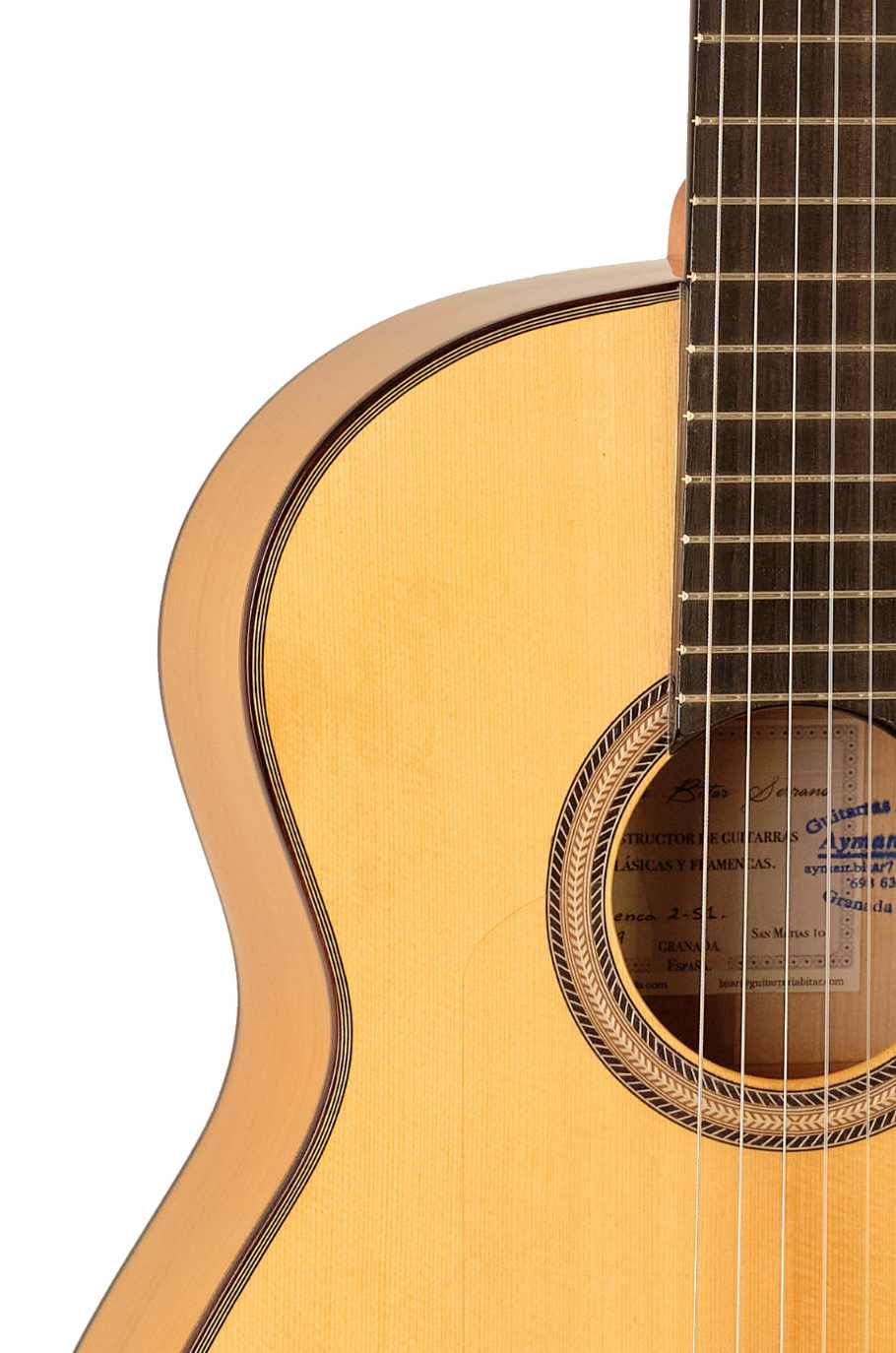 Esta guitarra flamenca profesional hecha a mano por Ayman Bitar Serrano, tiene todo lo que un guitarrista profesional necesita. Ejecución, calidad de maderas y un espectacular acabo.