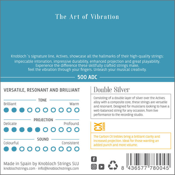 Juego de cuerdas Knobloch Actives 500ADC de tensión alta. Tiples de carbon CX. Destacan por su expresividad musical, aportando más seguridad y comodidad en la interpretación.Las cuerdas Knobloch Strings son el resultado de largos años de investigación, aplicando la tecnología mas sofisticada y utilizando materiales de la mas alta calidad que permiten mejores vibraciones.