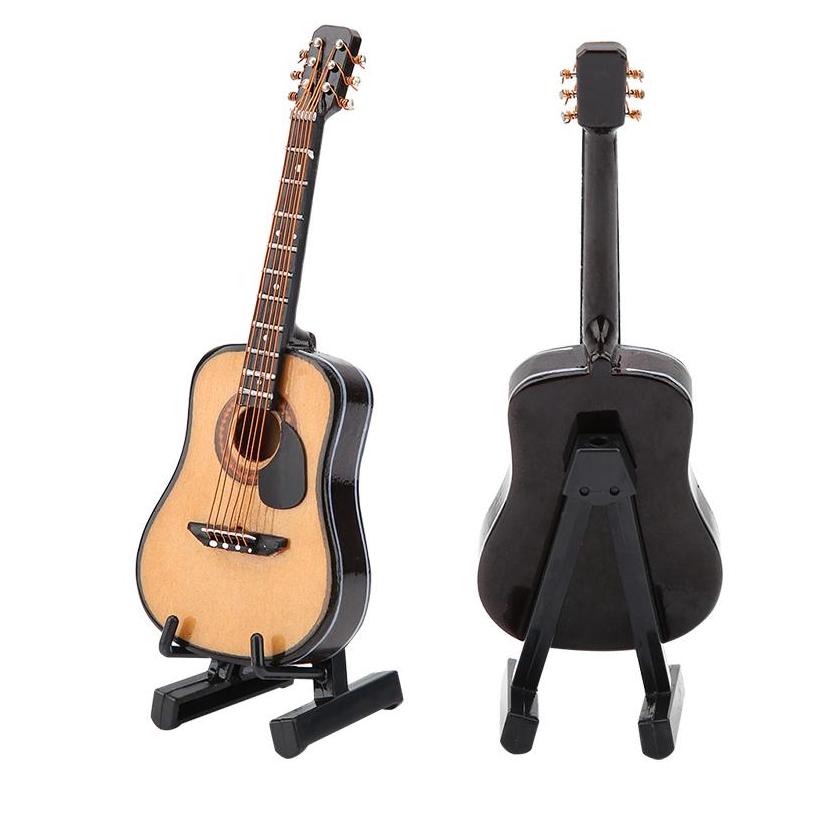 Incluye: 1 guitarra en miniatura + 1 soporte + 1 estuche forrado en rojo.